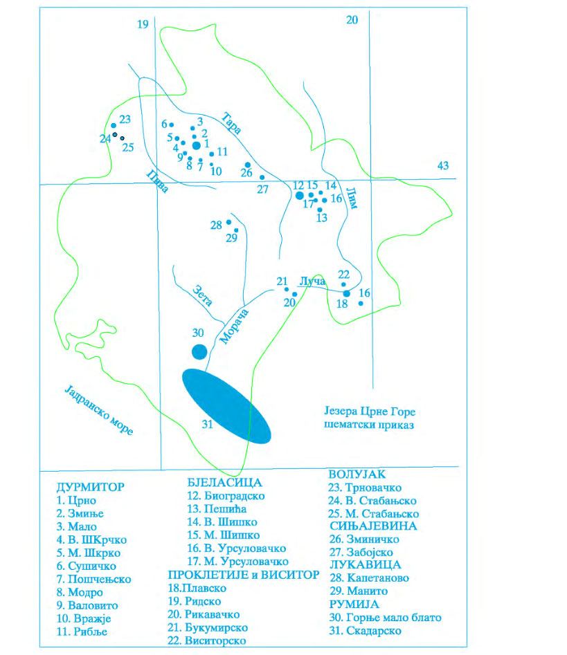 Испитивања планинских jезера Црне Горе почели смо припpемajући за штампу рад Морфометријске карактеристике jезера Jyгославије (1). Прегледом топографских карата уз коришћење литературе, желели смо да утврдимо што тачниjи броj jезера у нашоj земљи, а тиме и у Црној Гори. Топографске карте 1:50.000 биле су нам од велике користи и при изради дисертације (2). Поред тога, користили смо аерофотоснимке неких делова проучаваног терена. Топографске карте и аерофотоснимци били су од велике користи за сагледавање шире околине jeзера, одређивање неких морфометриjских показатеља, географског положаjа и друго.