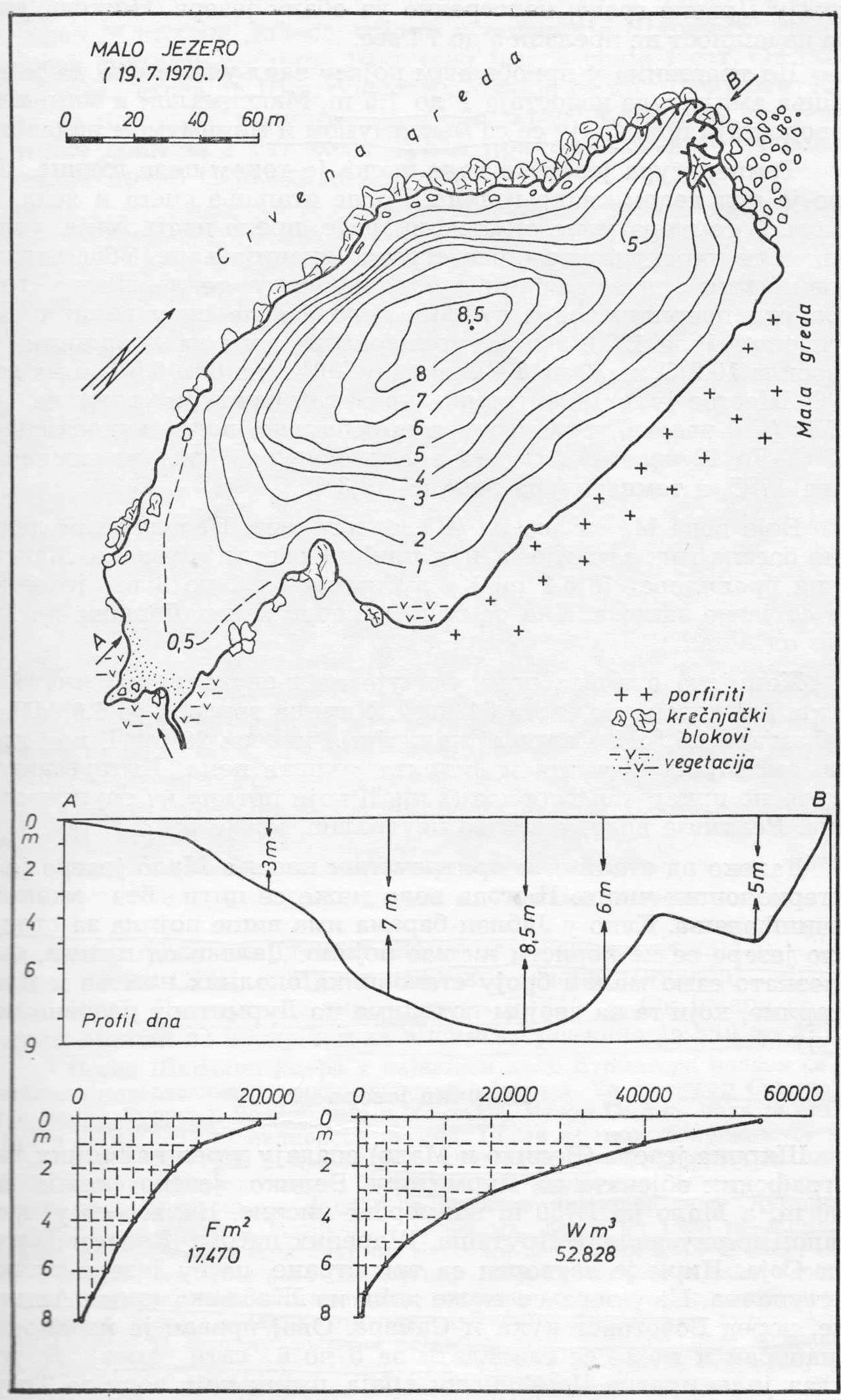 Површина и запремина се правилно смањују повећањем дубине. На правилан распоред површина и запремина указује правилан распоред изобата у односу на обалску линију. Изузетак чини изобата од 5 m. Она се у северном делу језера прекида, а затим поново јавља. Раседање терена на простору Малог језера условило је велике нагибе дна басена (56°). Најмањи нагиби су у јужном делу језера, а највећи у NW. Површина дна језера износи 21.305 m2.