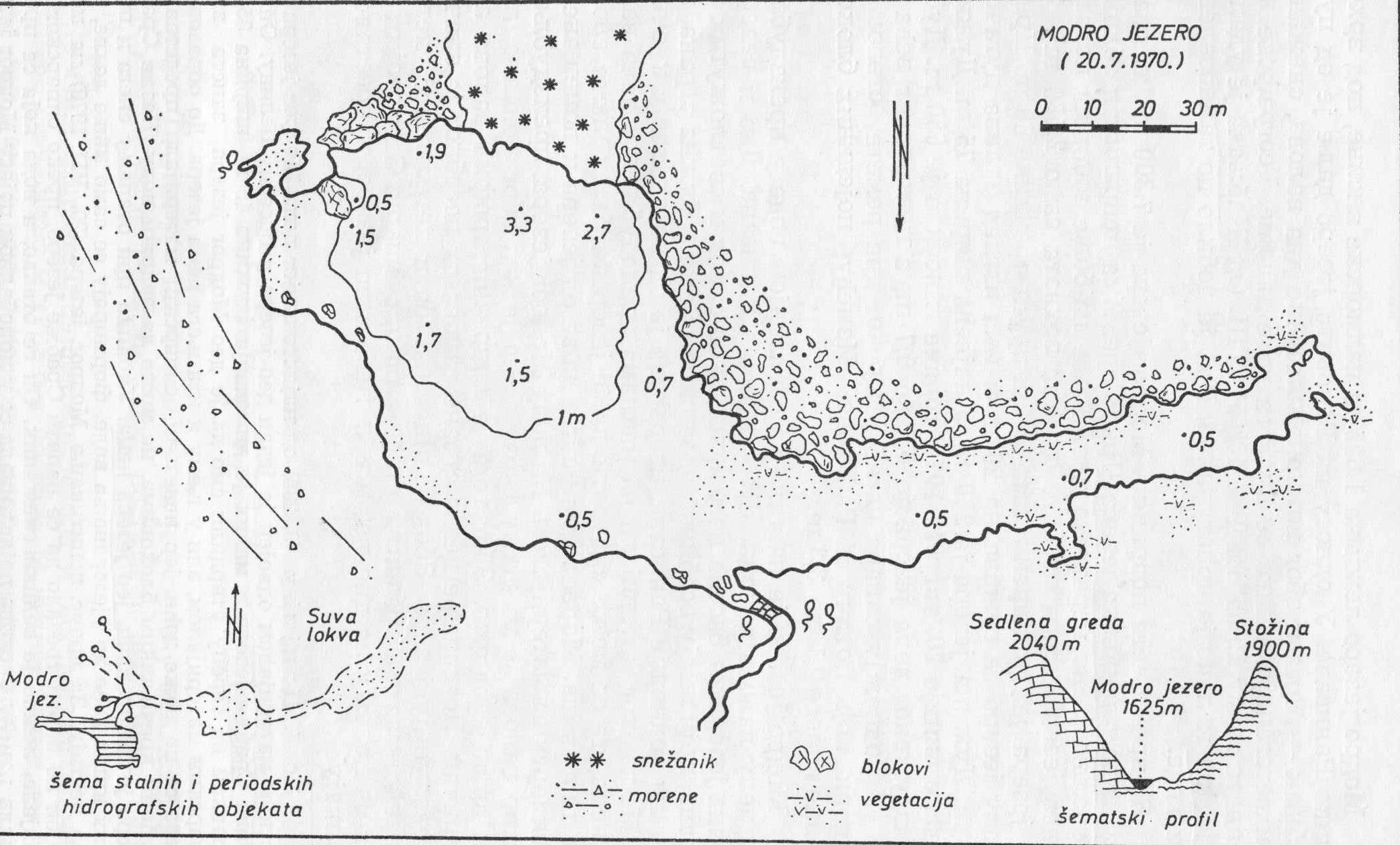 [1] По Ј. Цвијићу (9, 236) од најисточнијег дела Модрог језера сипарским материјалом одвојен је један део језера у посебну целину. Она се назива Срабље језеро и малих је димензија (дужина 45 m, ширина 35 m). Боравком на терену утврдили смо да је део Модрог језера заиста засут сипарским материјалом, али у њему и иза њега нема језера. До образовања језера се не може доћи, јер невезани сипарски материјал, представљен крупним кречњачким блоковима, не може да задржи веду. Назив Срабље језеро је неоправдан, јер језера нема. Уколико при отапању снега и после јачих киша дође до ујезеравања воде, формирају се само мање локве, које брзо нестају. За време испитивања Модрог језера (20. VII 1970) на месту где би по карти требало да се налази Срабље језеро, преко сипарског материјала, лежао је велики снежаник. Он се отапао, а вода која се процеђивала између блокова појављивала се у приобалном појасу Модрог језера.