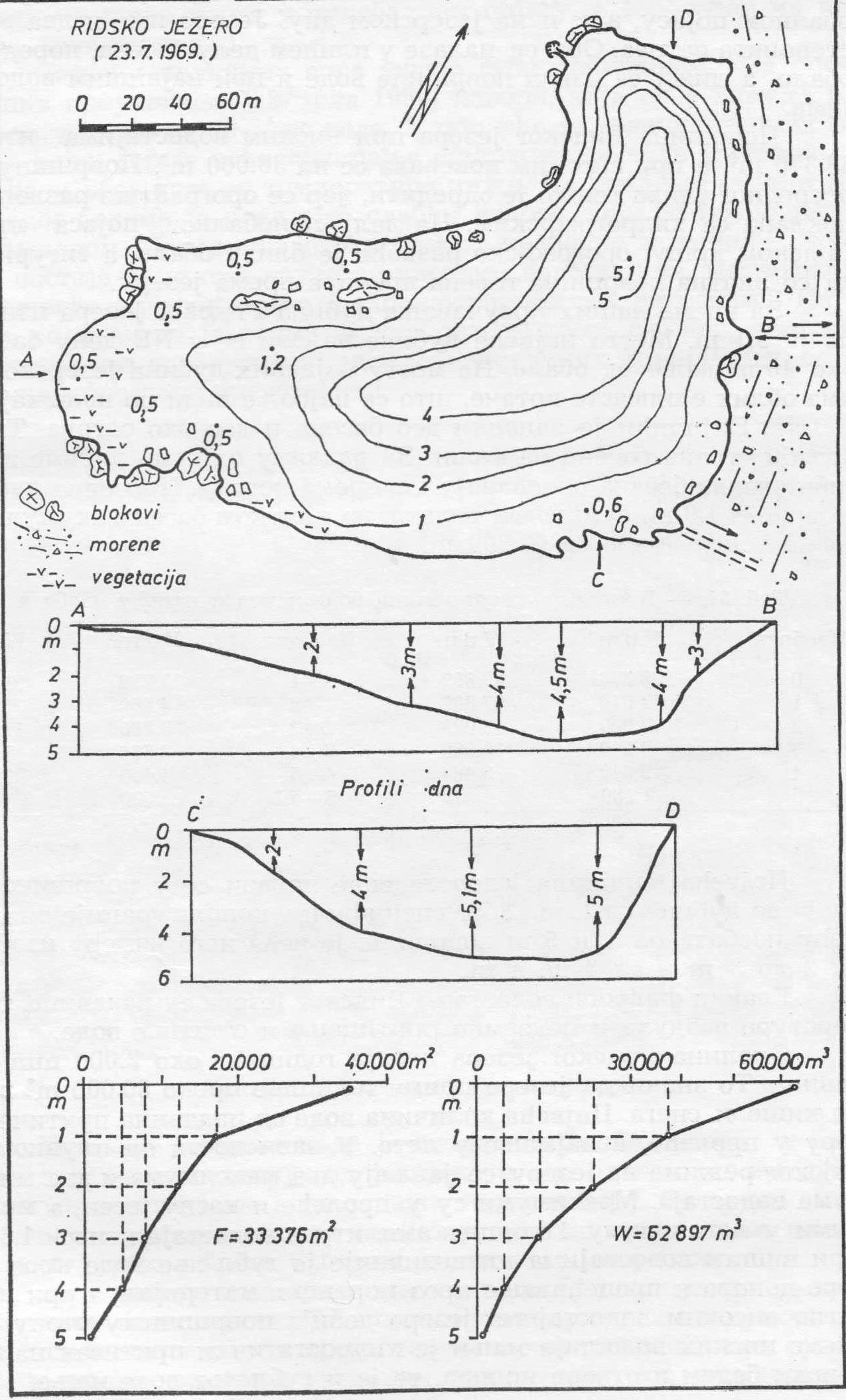 Највећа количина језерске воде налази се у површинском слоју до дубине од 1 m. Због специфичне конфигурације дна између изобата од 4 и 5 m површина је већа него измећу изобата од 2 до 3 m и од 3 до 4 m.